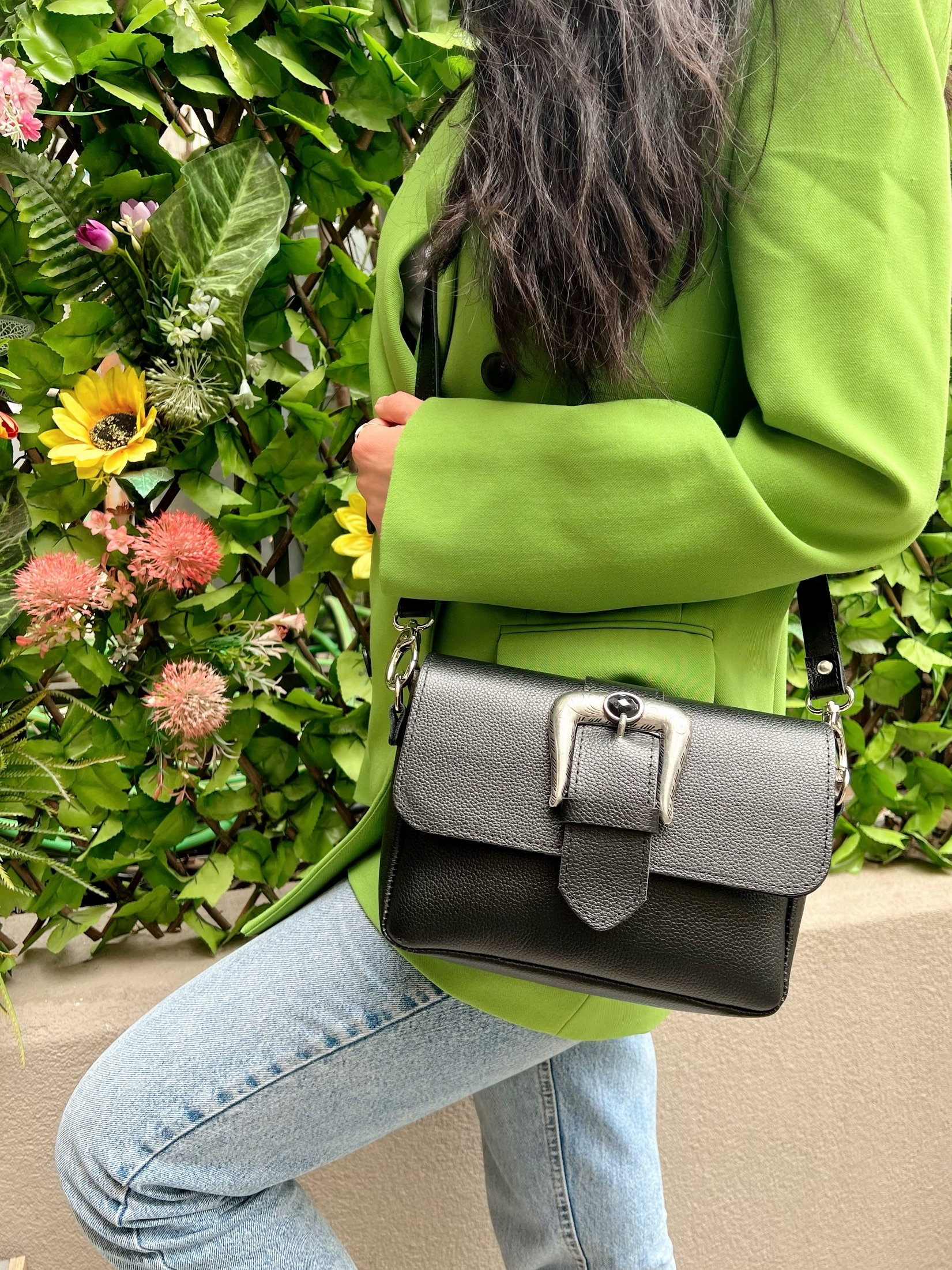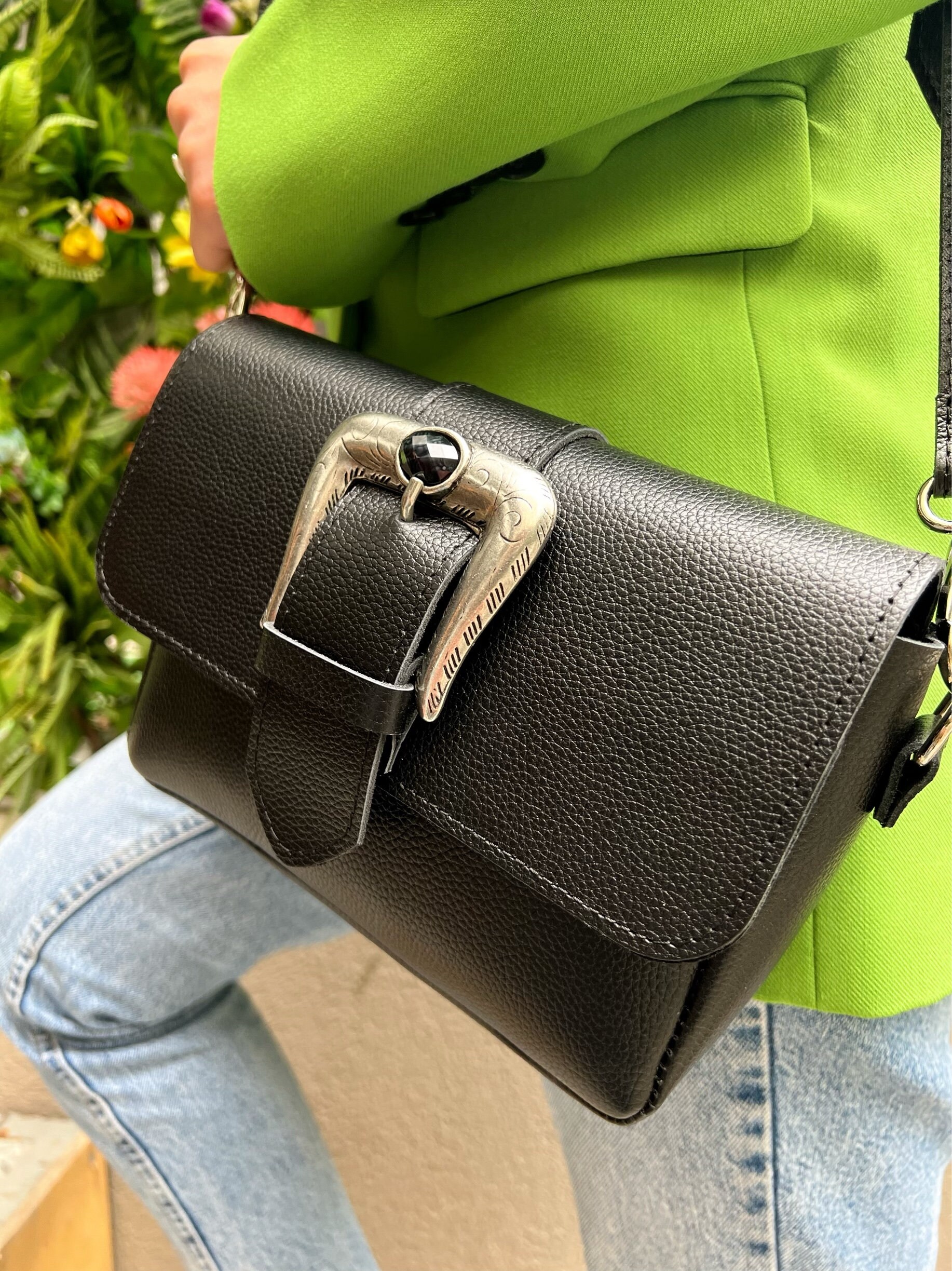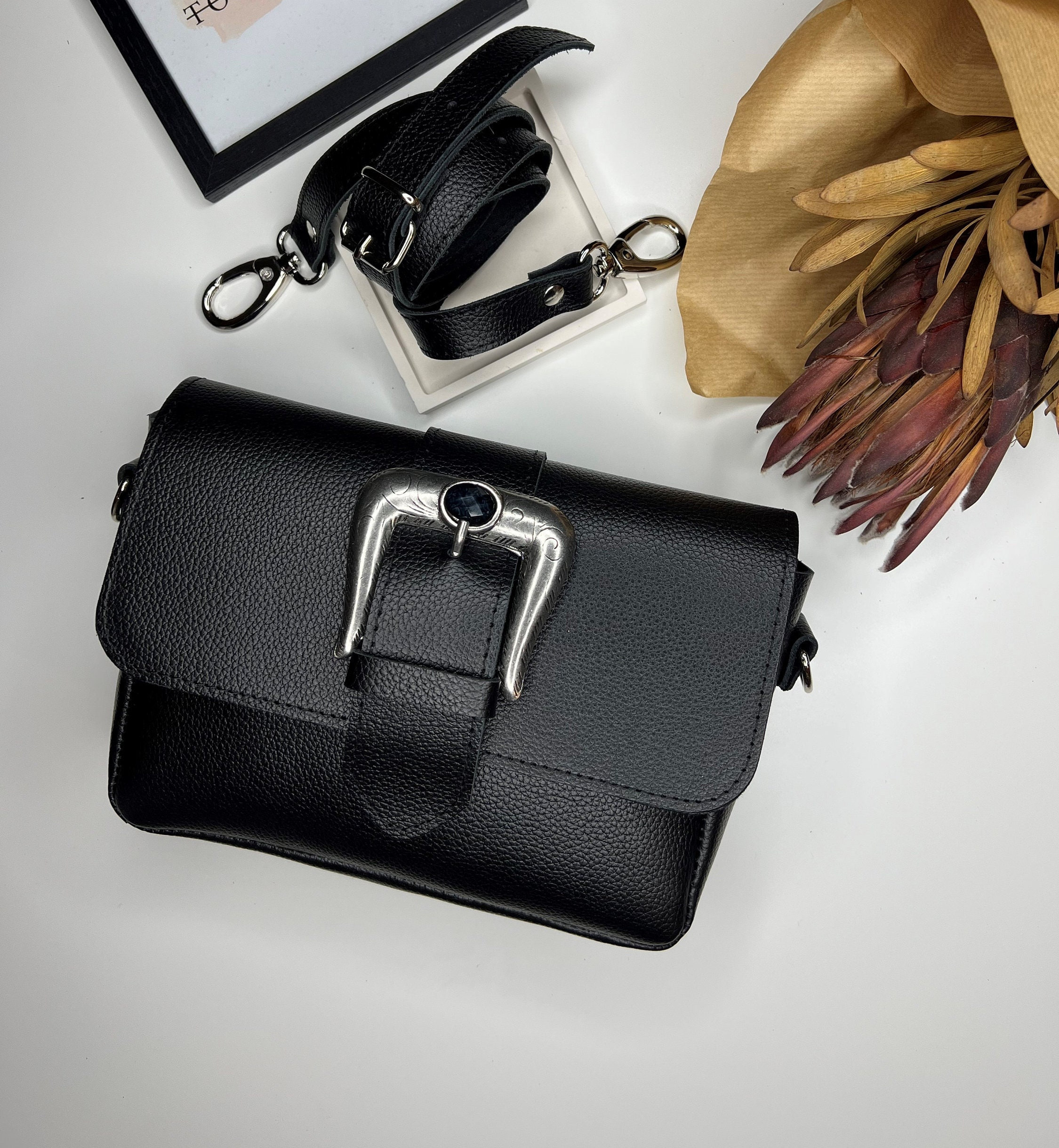 Introducing the exquisite “Bohemian Horse” Leather Shoulder Bag, handcrafted with precision and creativity. Made from luxurious Full Grain Leather in a sleek black color, this unique bag showcases a captivating horseshoe-shaped buckle adorned with a stunning black onyx stone. The rectangular shape and adjustable strap add to its charm, while the back zipper pocket, spacious interior section, and modern design ensure both functionality and style. Discover this exclusive masterpiece only at us Store.