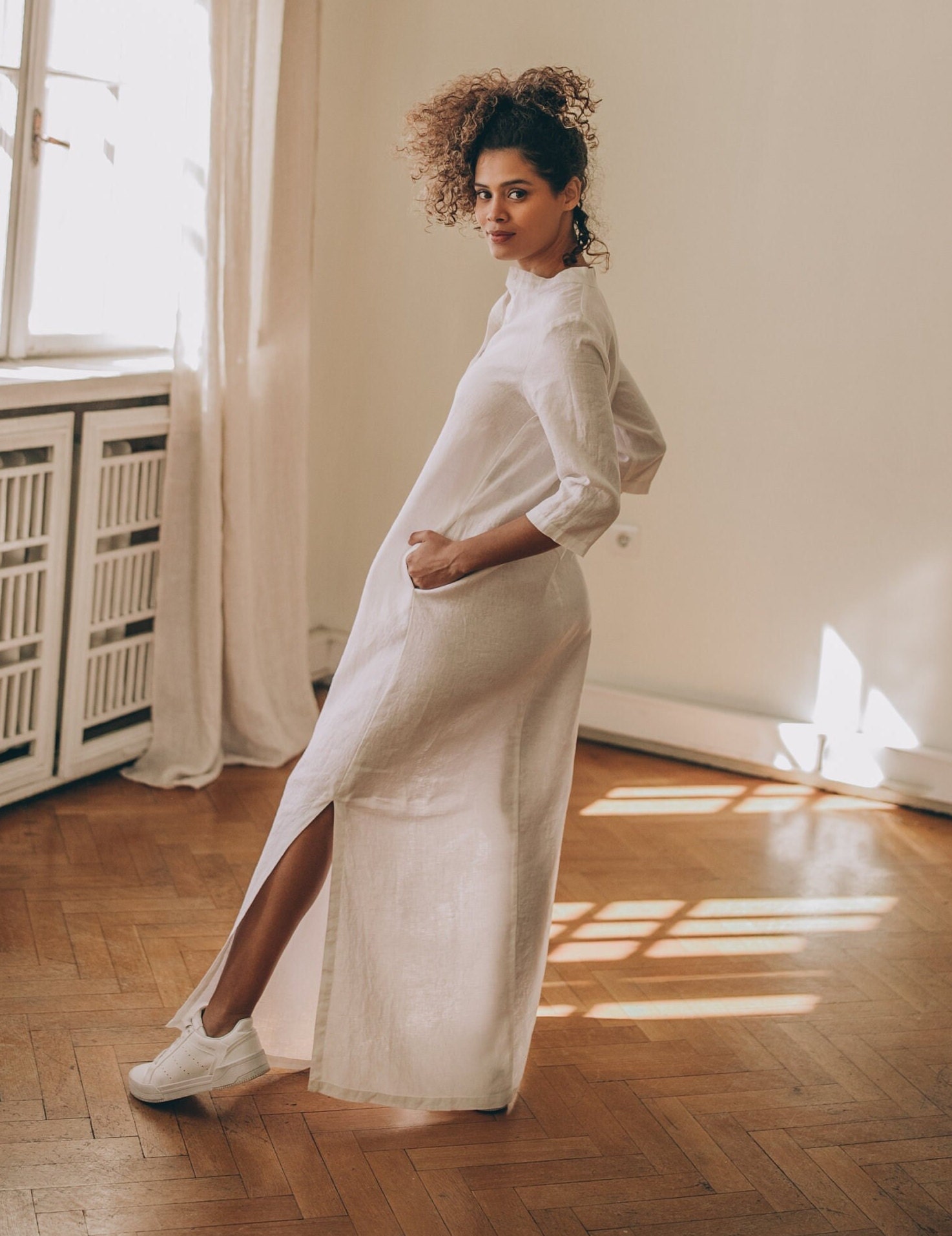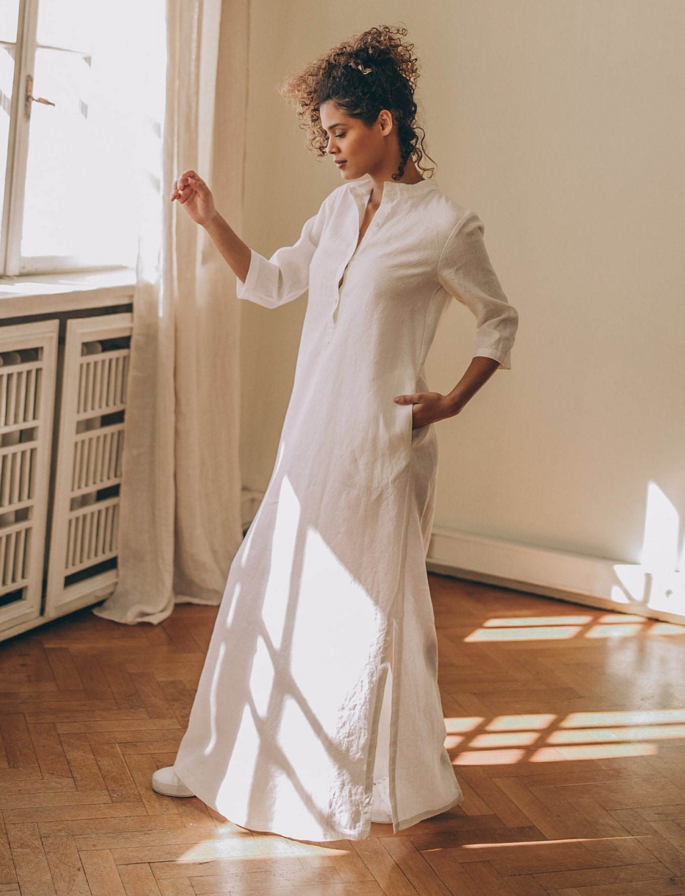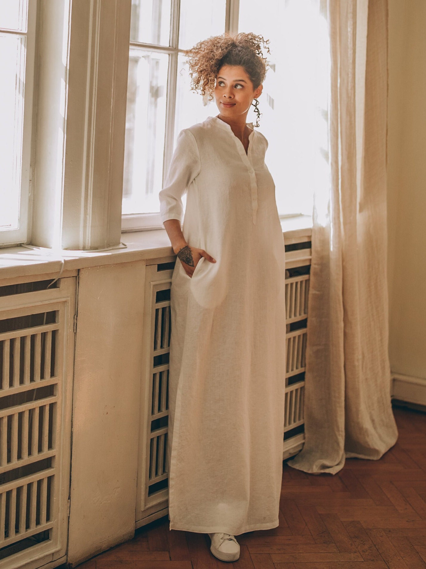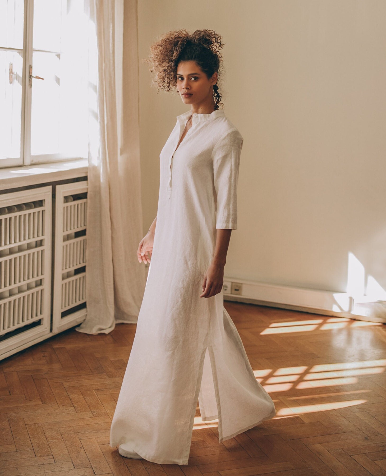 Long linen kaftan dress made from high quality 100% linen material. This stylish yet bohemian dress has a straight loose line, split neckline with button closure, elbow length sleeves and side slits. Featured in a white linen here, this linen dress could be made in a variety of colors.