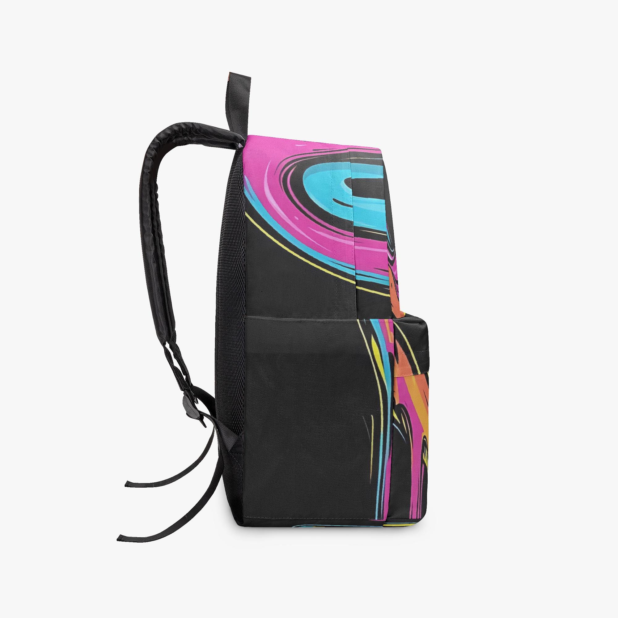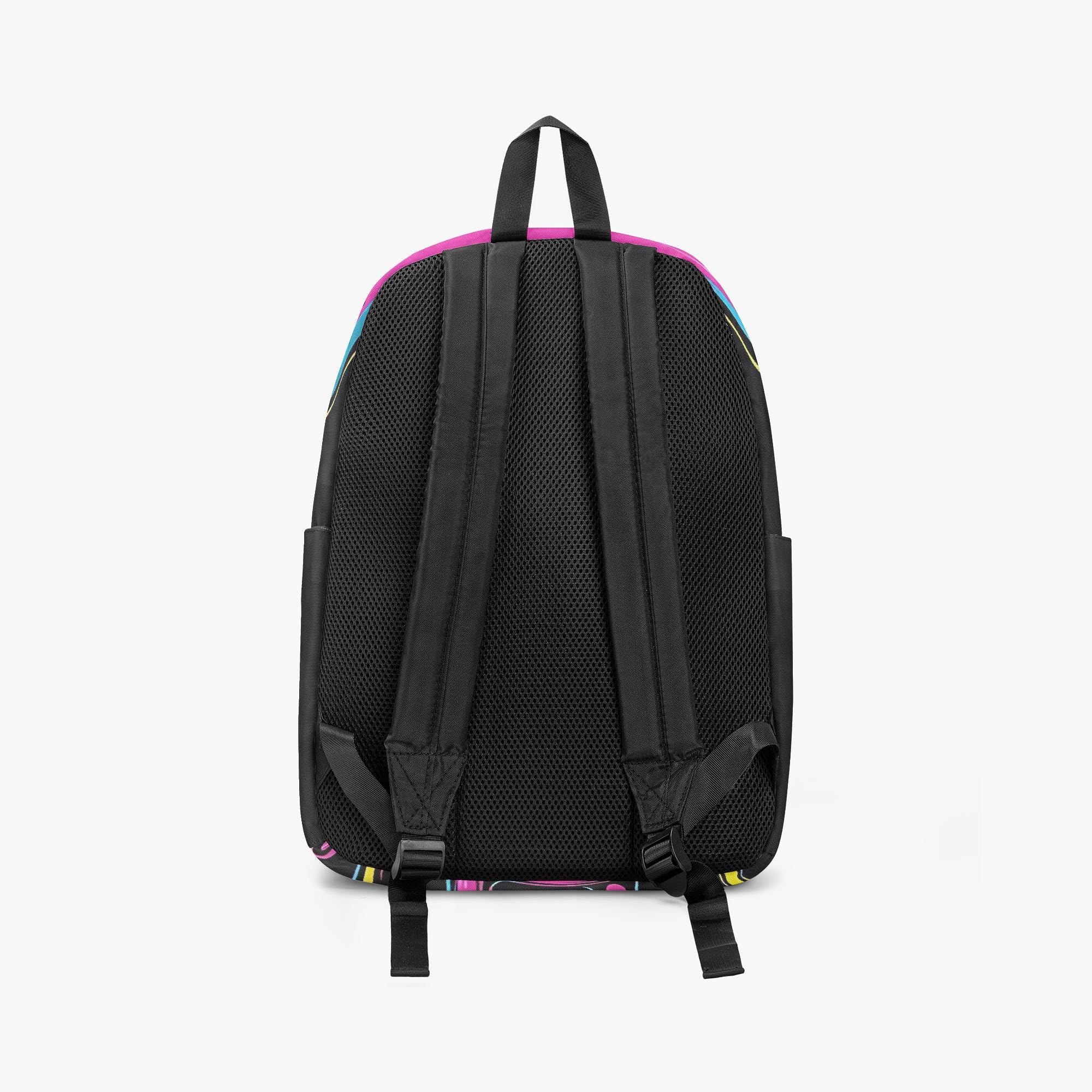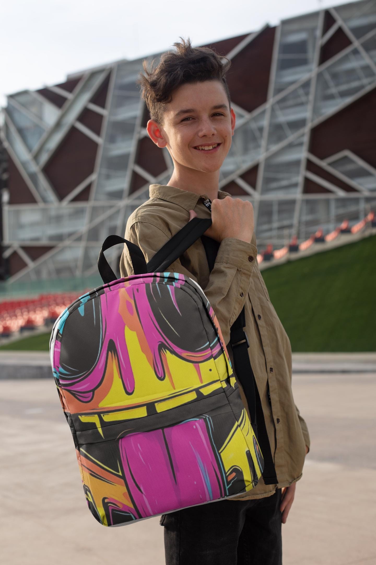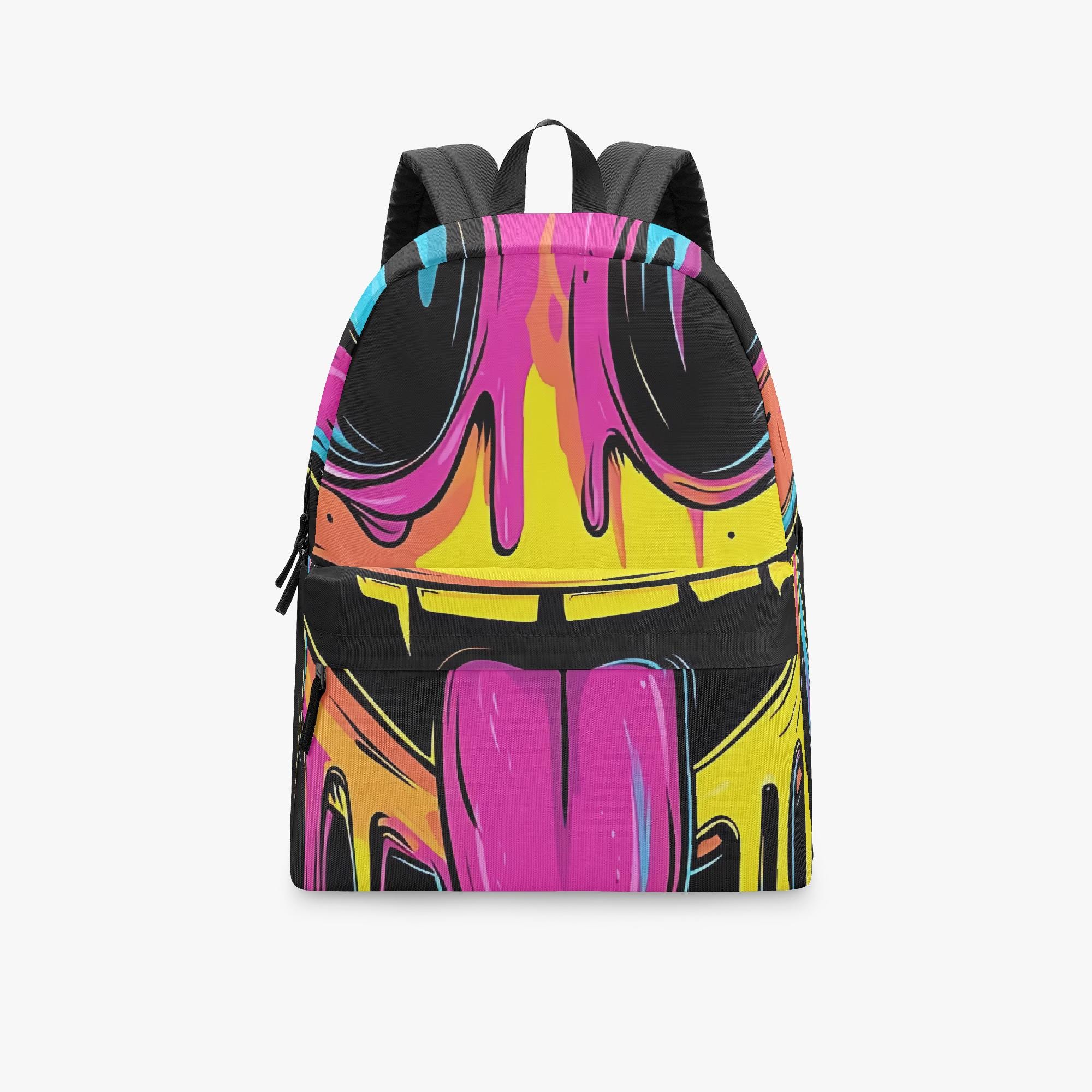 Turn heads with neon! 😜 This all-over print canvas backpack features a bold smiley-tongue graffiti face in high-impact colors. Light, tough, and ready for school, travel, or festivals.